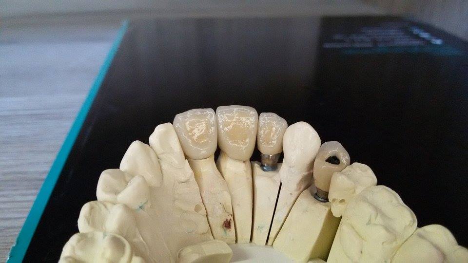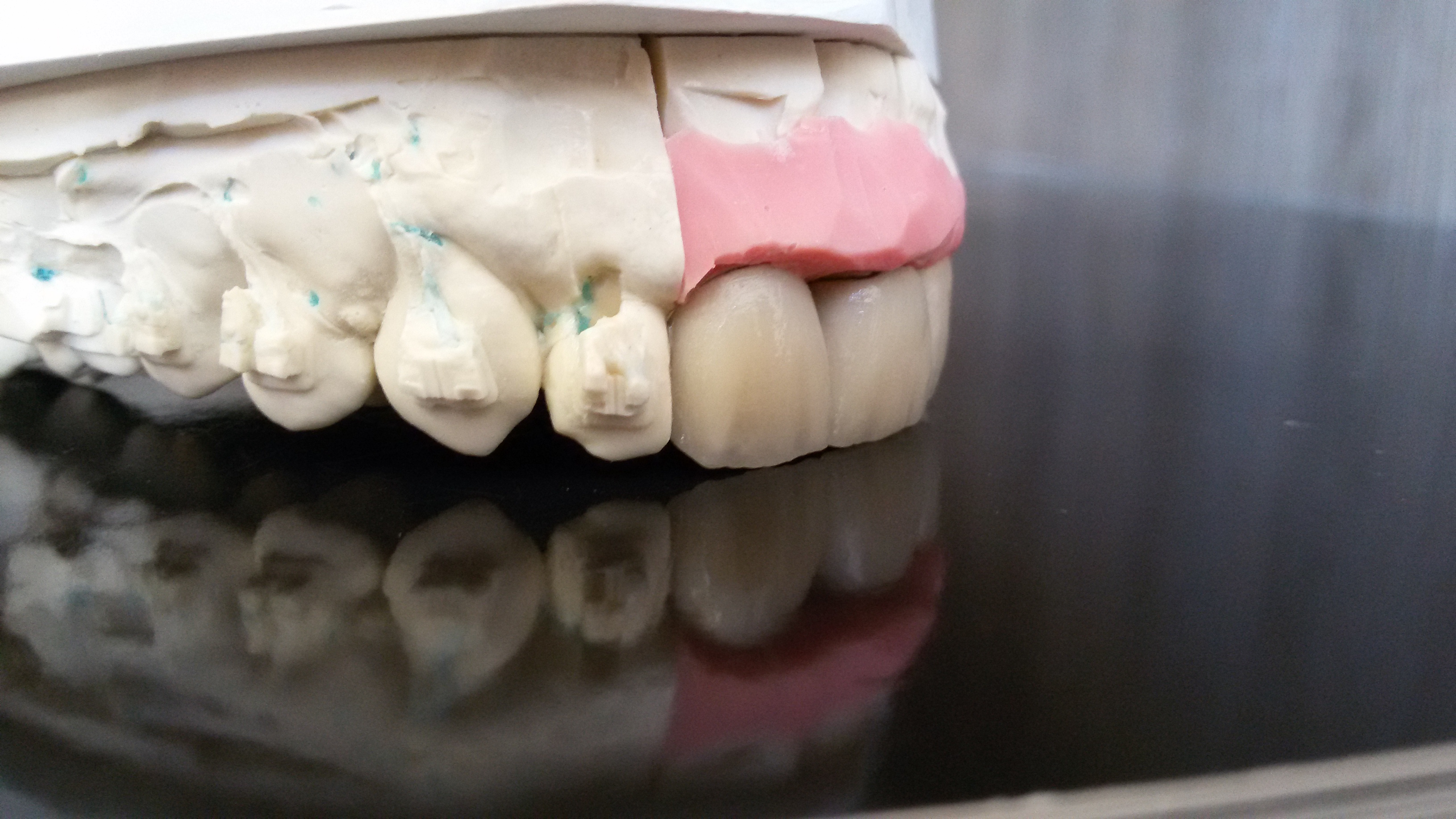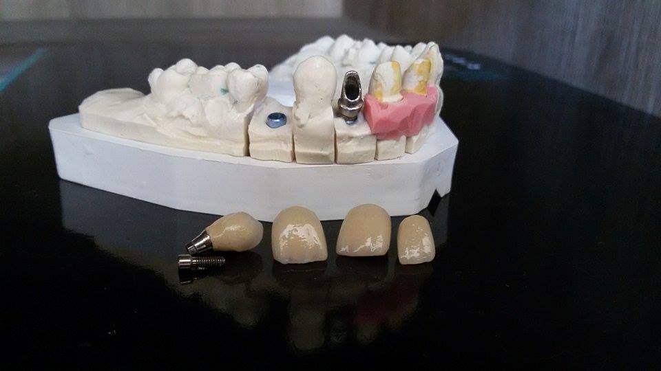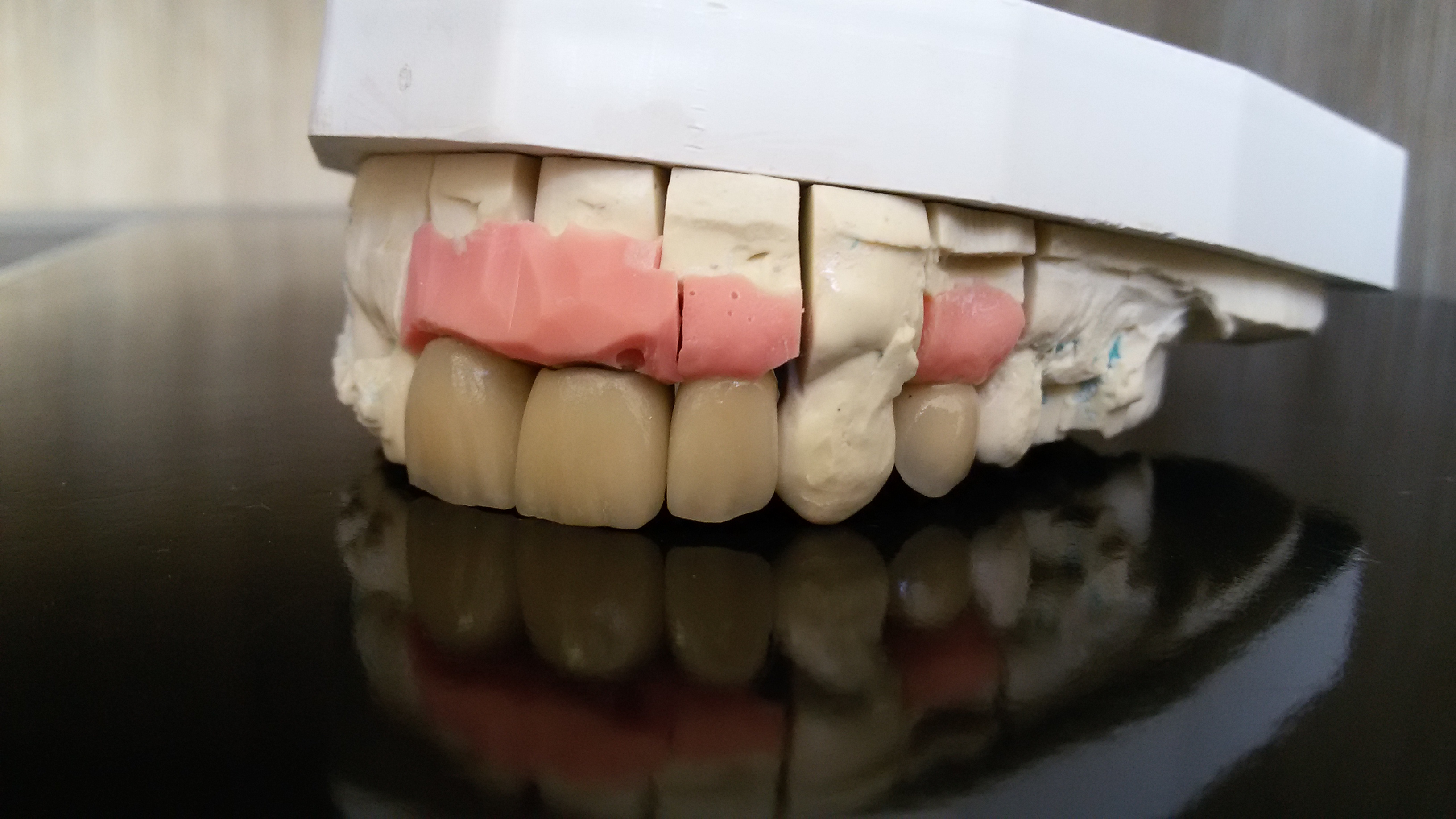 V tomto případě si lékař přál zkombinovat hned tři různé způsoby řešení náhrady chybějících, nebo vylepšení estetiky stávajících zubů, v podobě metalokeramických korunek. Horní střední řezáky byly cementovány na vlastní zubní pahýly, levý postranní řezák byl cementován na individuální abutment našroubovaný na implantát, a první levý třenový zub byl zhotoven jako šroubovaná metalokeramická korunka na implantát.