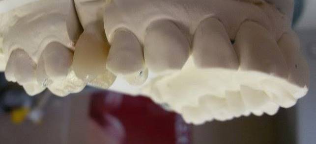 Detailní záběr na tvar a povrchovou texturu můstku po nacementování v ústech pacienta.