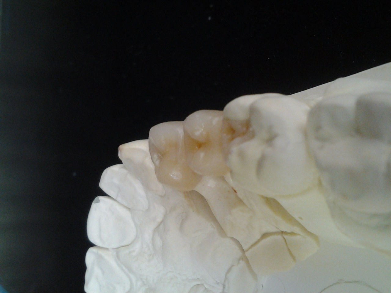 V tomto případě se ošetřující lékař rozhodl zvolit méně invazivní metodu, spočívající ve volbě korunkové inlaye, o niž se můstek opírá na vlastním zubu, konkrétně levé horní stoličce. Tím se předešlo zbytečné ztrátě zdravé zubní tkáně, o niž by pacient nevratně přišel, kdyby se zub nabrousil na běžný pahýl.