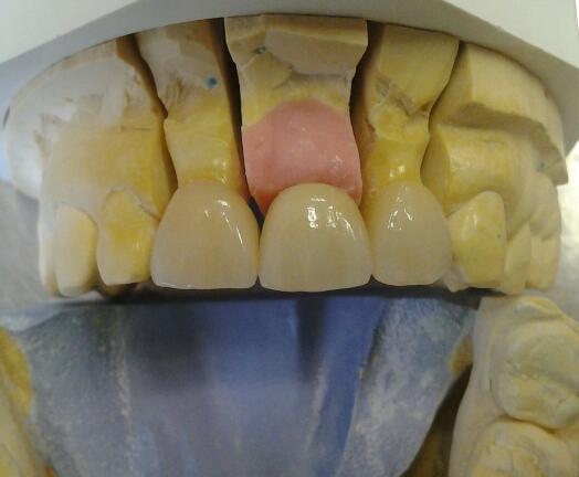 Pacient přišel o horní velký řezák. Jelikož bylo zapotřebí ošetřit i sousední řezáky, avšak pacient nehleděl na nákladnost řešení, od nejpoužívanějšího řešení v podobě tříčlenného můstku jsme upustili a namísto toho jsme zhotovili tři celokeramické solo korunky. Pravý horní velký řezák a levý malý horní řezák byly cementovány na vlastní nabroušené zuby, pravý horní velký řezák pak na titanový abutment našroubovaný na zubní implantát.